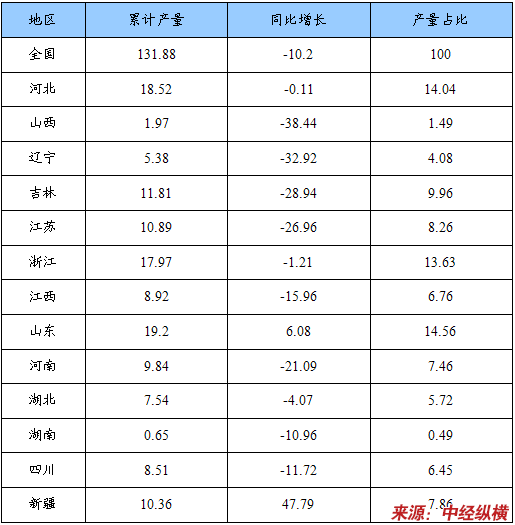 2008年1~12月,我国粘胶纤维累计产量为131.88万吨,其中,累计产量前5个省(市、区)是山东、河北、浙江、吉林、江苏,累计产量分别为19.20、18.52、17.97、11.81、10.89万吨,其累计产量合计占全国粘胶纤维总产量的59.44%。