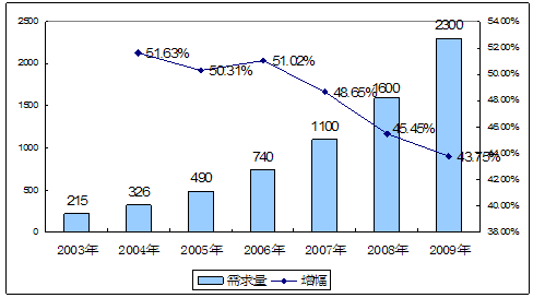 目前国内阿维菌素产能3800吨/年(折百计,以下同),09实际产量应在2400吨/年左右。自1995 年-2008年以来需求增幅在50%。2009年由于虫害较轻和产能大幅扩张等原因,阿维菌素的供求形势呈前紧后松的供求局面,需求总量增长,全年增幅在30%以上,增长幅度回落。其中,甲维盐拉动的阿维菌素精粉需求比较大。