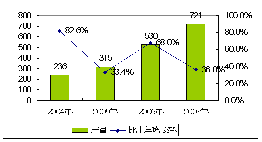 伴随着不锈钢市场的快速发展,我国不锈钢产量也结束了长期徘徊的局面,实现了高速增长。我国不锈钢产量从2000年的46万吨增长到2004年的236万吨,年平均增长率在82.6%,占国内市场需求的比重也由2000年的24.47%提高到2004年的52.80%。而同期,世界不锈钢产量则仅以6%左右的速度增长。