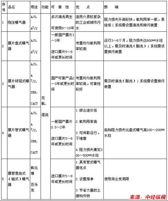 图表 常用几种微孔曝气器的功能、特点比较