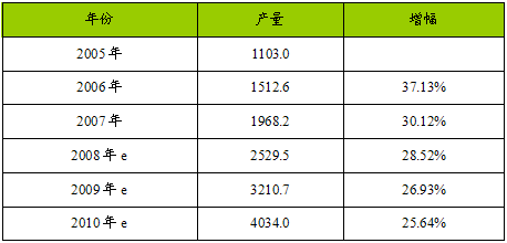 近几年,中国国内经济继续保持快速发展,钛产品市场需求呈现高速增长势态。航空航天、“两碱一盐”、石化、电力、海洋石油、舰船以及体育休闲等钛产品主要应用市场继续保持旺盛需求,同时计算机等新的钛需求增长点也在不断涌现,并呈上升趋势。自05年开始,中国的钛合金产量基本都是维持在30%左右的高速增长阶段,产能一度表现出高速增长的趋势。2007年我国钛合金产量1968吨,比06年同期增产29.47%,到目前我国钛合金年产量大约在两千吨左右。随着我国综合国力的提高,钛合金在国内的需求量增长很快。钛合金已由上世纪80年代的每年使用二、三百吨,增长到目前每年的需求量在10000吨左右,而国内每年生产能力仅有3000多吨,巨大的需求缺口依靠进口。