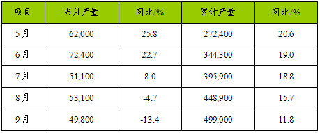 根据中国国家统计局对于镁 行业 的数据统计,从5月份到9月份,这五个月里中国的原镁产量数据见下表。