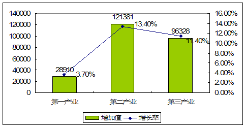 受世界经济快速增长和国内需求旺盛的拉动,全年国内生产总值246619亿元,比上年增长11.4%。分产业看,第一产业增加值28910亿元,增长3.7%;第二产业增加值121381亿元,增长13.4%;第三产业增加值96328亿元,增长11.4%。第一产业增加值占国内生产总值的比重为11.7%,与上年持平;第二产业增加值比重为49.2%,上升0.3个百分点;第三产业增加值比重为39.1%,下降0.3个百分点。分季度看,一季度增长11.1%,二季度增长11.9%,三季度增长11.5%,四季度增长11.2%。