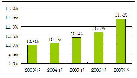 从2003年开始,我国经济增长率一直在10%平台上加速。2003年的增长率为10.0%,2004年为10.1%,2005年为10.4%。2006年我国GDP为209407亿元,增长10.7%,增速比上年加快0.3个百分点,2007年中国经济增长11.4%,是14年来的最大增幅。