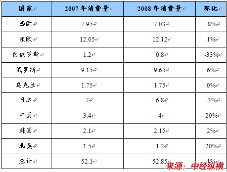 国际壁纸制造商协会公布的2008年各国消费数据 单位:亿平方米