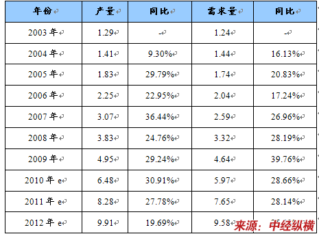2003-2012年聚氯乙烯壁纸产量及需求量