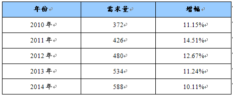 2010-2014年中国内河船产品需求量预测 单位:万载重吨
