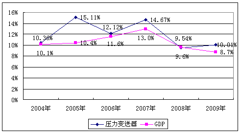 从图中可以看出,压力变送器 行业 产值增幅与与国家宏观经济环境相关程度较大,随着GDP的增加,产值增加, 行业 产品总产值增长率高于国家GDP增长率, 行业 前景看好。