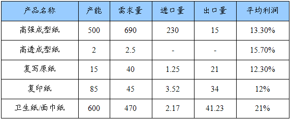 国内部分纸种产能、需求量、进出口数量和平均利润率统计表