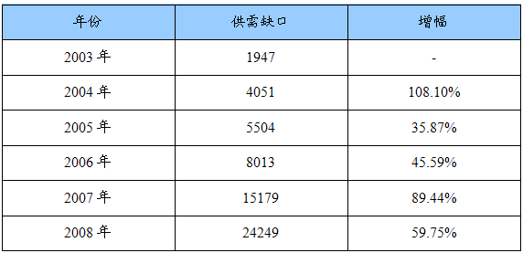 从国内市场供求关系来看,近几年,随着国内市场包装 行业 及印刷 行业 对薄型纸需求的快速增长,国内产品产量无法满足市场需求,且供需缺口越来越大,到2008年产品市场供需缺口为24249吨,相当于2003年市场供需缺口的12倍。