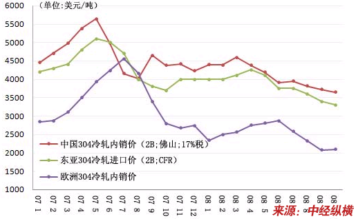 2007年1月——2008年10月欧洲、东亚市场304不锈钢冷轧价格走势
