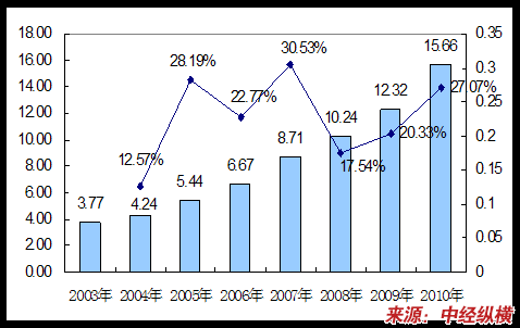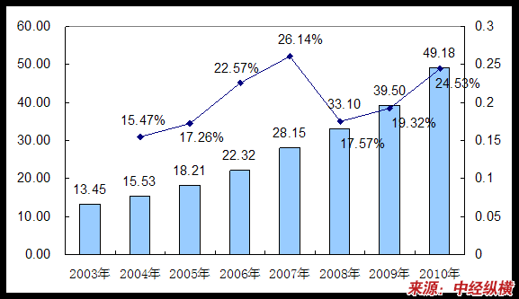 2003——2010年不锈钢反渗透膜壳市场规模及预测图