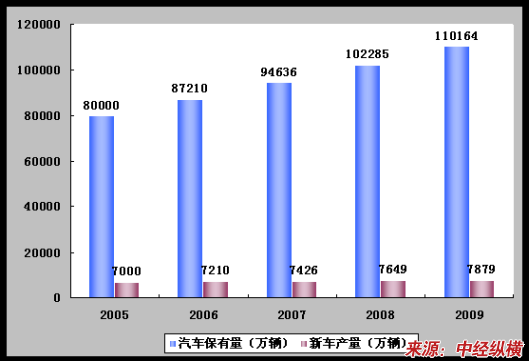 2005-2009年全球汽车保有量和新车产量趋势图