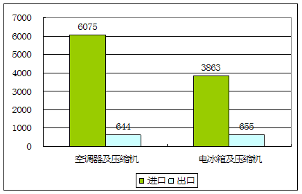 2007年出口方面,我国家电及零件出口额为322.73亿美元,比2006年同期增长20%。重点产品出口数量和金额:空调器及其压缩机出口数量6075万台,同比增长33%;电冰箱及其压缩机出口数量3863万台,同比增长37%。