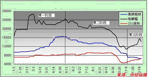 第二阶段:供过于求价格大幅下跌。随着道路和电力系统恢复正常运转,原材料厂商也加大力度生产。而下游用户钢厂方面行情低迷对原材料的采购可谓小心谨慎。造成整个原材料市场资源过剩,供过于求必将存在价格的竞争。不锈钢行情的每况愈下也在10-11月份到了谷底。从而电解锰、高碳铬铁以及废料价格纷纷下滑,截止到11月9日三者分别为10800、7100以及5200元/吨。比年初还要分别低5700、2225以及1700元/吨。
