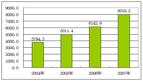 2007年国内的塑料制品累计总产量在3161.8万吨,较2006年同期增长13.9%。2007年,塑料制品业工业总产值累计8018.16元,同比增长27.1%。从各子 行业 来看,塑料丝、绳、编织品制造业工业总产值806.99亿元,同比增长34%,是塑料制品业中增长最快的;而塑料零件制造业实现工业总产值863.48亿元,同比增长16.8%,是塑料制品业中增长最慢的,增速比上年下降7.6个百分点,低于塑料制品业平均增速10个百分点。