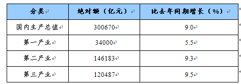 初步核算,全年国内生产总值300670亿元,比上年增长9.0%。分季度看,一季度增长10.6%,二季度增长10.1%,三季度增长9.0%,四季度增长6.8%。分产业看,第一产业增加值34000亿元,增长5.5%;第二产业增加值146183亿元,增长9.3%;第三产业增加值120487亿元,增长9.5%。