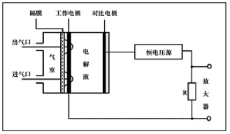 恒电位电解式气体传感器的原理是:使电极与电解质溶液的界面保持一定电位进行电解,通过改变其设定电位,有选择的使气体进行氧化或还原,从而能定量检测各种气体。对特定气体来说,设定电位由其固有的氧化还原电位决定,但又随电解时作用电极的材质、电解质的种类不同而变化。