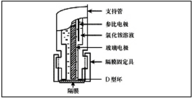 现以检测NH3传感器为例说明这种气体传感器的工作原理。其基本结构如图所示,作用电极是可测定pH值的玻璃电极,参比电极是Ag/AgCl电极,内部溶液是NH4Cl溶液。NH4Cl离解,产生铵离子NH4+,同时水也微弱离解,生成氢离子H+,而NH4+与H+保持平衡。