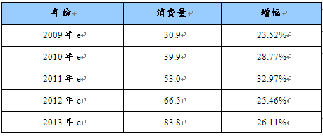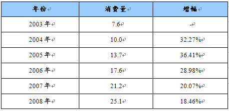 2003-2008年我国真空采血管消费量及增幅统计表 单位:亿支