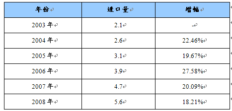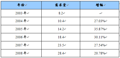2003-2008年我国真空采血管需求量及增幅统计表 单位:亿支
