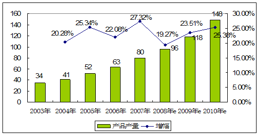 我国电感传感器产品总体上产量不大,但 行业 产量增长速度较快,从2004年起年产量增长速度超过20%。近几年我国机械加工 行业 对机床设备的更新改进,使得量仪 行业 看好了精密电子量仪产品的发展,原有企业产能的扩大和 行业 新进入者的增多使得产品产量增长较快。目前产品国内产量分布主要集中在江浙、广东、广西等地,这也是由于这些地区是我国微电子技术发展较快和厂商比较集中的地域。我国电感传感器目前的应用量较小,但其 行业 未来市场需求较大,同时国内生产技术也在逐步完善,预计未来几年在市场需求快速增长的带动下 行业 产量年增长速度将在20%以上。国内高档产品的产量比例将有所提高。