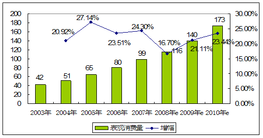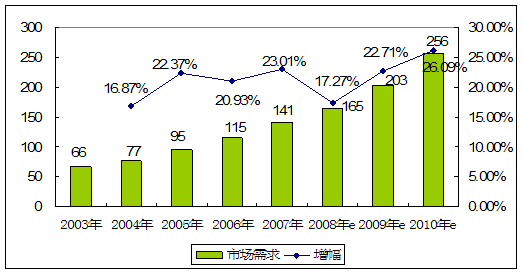 改革开放20多年来,我国量仪 行业 得到了快速发展。我国光栅类数显产品产量约占世界市场的30%,容栅类产量约占世界市场的20%。随着国际市场量具数显化率的提高,我国数显量具的出口高速增长,机械量具的出口量逐年减少,我国机械量具的出口量已从2000年的825万套下降至2004年的335万套,数显量具的出口量从2000年的25万套增长到2004年的110万套。2010年预计全国数显量具产品出口量将达400万套。2005年全球生产各种数显量具仅有700万套,其中我国生产的数显量具就有220万套,约占世界总产量的30%。根据对国际市场的需求 分析 ,到2010年全球对数显量具的需求量将达到2000万套,而且其中技术含量高、性价比优的产品所占的比例越来越大。未来3-5年国内量仪 行业 需求将保持年均15%以上的增长,每年新增的市场需求达7.5亿元;其中,电子数显量具量仪增长超过30%。