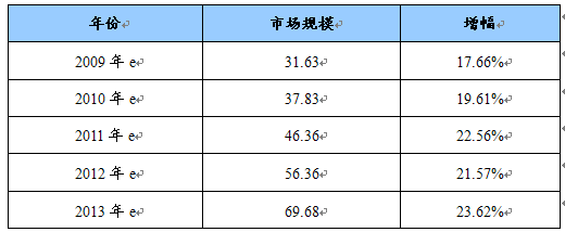 2009-2013年我国自动化输送系统市场规模及增幅预测表 单位:亿元