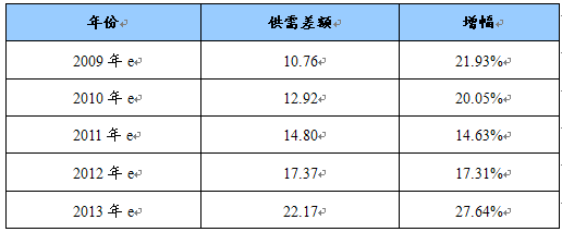 2009-2013年我国自动化输送系统供需差额及增幅预测表 单位:亿元