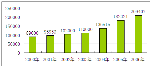 据海关初步统计,2006年全国进出口总值为17606.9亿美元,同比增长23.8%,其中,出口9690.8亿美元,增长27.2%:进口7916。1亿美元,增长20%;进出口顺差达到1774.7亿美元,增长74%。全年包括金融领域在内共吸收FDI(外商直接投资)694.68亿美元。