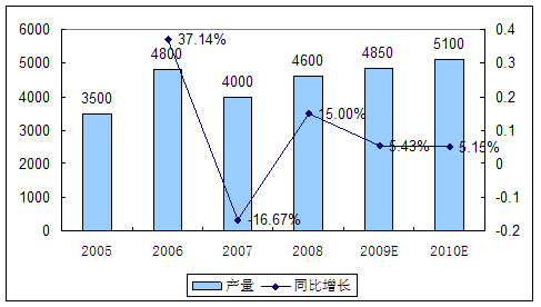 2005—2010年微晶玻璃产量 分析 及预测图