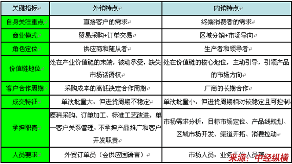 内销型企业与外销企业的不同特点,我们可以看出,外销型企业特点的关键词就是:被动、弱势、稳定性差、简单交易、客户需求导向;而内销型企业特点的关键词是:主动,强势、相对稳定、多维利润、消费需求导向。