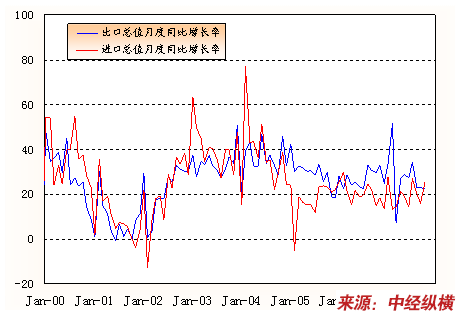 1999年8月-2007年10月出口总额月度同比增长率与进口总额月度同比增长率
