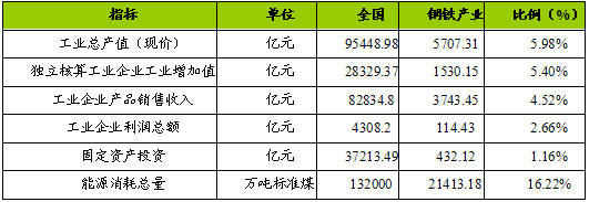 从上表中可以看出,中国钢铁产业在整个国民经济中占有重要地位,尤其是钢铁产业能源消耗,占到了全国能源消耗总量的16.22%。工业总产值、工业增加值等指标钢铁产业约占5%。由于钢铁产业属于趋于成熟的 行业 ,钢铁产业已逐步成为微利的 行业 ,其利润总额仅占全国工业企业利润总额的2.66%;其固定资产投资在全国投资中的比重仅占1.16%。