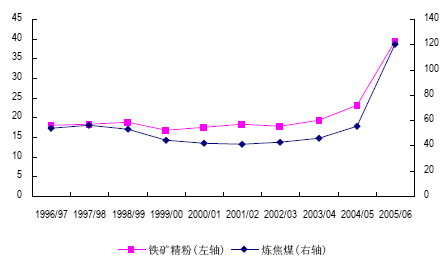 与此同时,全球粗钢产量从7.77亿吨升至9.64亿吨,很大程度上也是基于亚洲,特别是中国粗钢生产快速增长的贡献。中国粗钢产量从1998年的1.28亿吨提高至2003年的2.32亿吨。1998~2003年的5年间,全球粗钢消费量和产量的增幅均超过了全球GDP的增长(全球GDP同期增长了19%)。