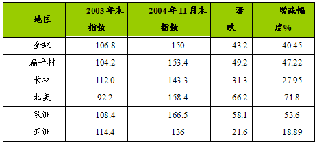 国内钢材价格指数方面:与国际钢材价格相比,2004年1-11月国内钢材价格走势波动较大,其中4、5月份还出现大幅下挫,不过自7月份以来,尽管建筑钢材市场震荡较大,特别是近两个月出现明显回落,但由于板材走势的强劲使国内钢材价格指数处于持续小幅攀升状态,目前国内钢材价格指数已处于今年最高位。从品种上看,根据冶金价格信息中心对全国23个主要城市钢材市场重点监测的八大品种中,与2003年末相比有六个品种价格上涨:中厚板6mm价格上升675元/吨,升幅16%,指数从115.92升至134.38,涨18.46点;热轧薄板1mm价格上升873元/吨,升幅20.7%,指数从102.33升至123.5,涨21.17点;冷轧薄板0.5mm价格上升1257元/吨,升幅24.7%,指数从104.22升至130,涨25.78 点;热轧卷板2.75mm价格上升929元/吨,升幅24.33%,指数从99.48升至123.68,涨24.2点;镀锌板0.5mm价格上升852元/吨,升幅14.8%,指数从111.46升至127.94,涨16.48点;无缝管159×6mm价格上升1188元/吨,升幅26.1%,指数从98.27升至123.85,涨25.58点。两种价格下降的品种是线材和螺纹钢,其中线材6.5mm价格下降179元/吨,降幅4.8%,指数从108.16降至102.96,跌5.2点;螺纹钢Φ12mm价格下降238元/吨,降幅6.2%,指数从108.29降至101.6,跌6.69点。2004年10月份与去年末相比,国内钢材市场综合价格平均上涨669元/吨,涨幅15.19%,综合价格指数由105.86升至121.94,涨16.08点。