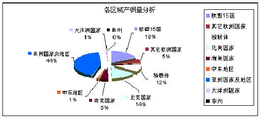 它们的粗钢产量合计为9.45亿吨,比上一年增长了6.7%。其中亚洲4.28亿吨,同比增长12%,欧盟15国1.6亿吨,增长0.8%,北美1.23亿吨,下降0.2%,独联体1.06亿吨,增长6%,其它欧洲国家4847万吨,增长7.7%,拉丁美洲4270万吨,增长4.5%,非洲1607万吨,增长2.4%,中东地区1287万吨,增长8%,大洋洲837万吨,增长1%。