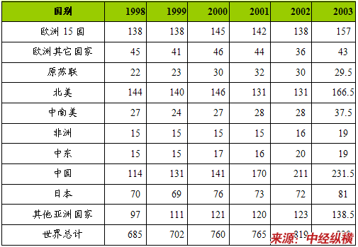 OECD的资料还反映出,1998-2003年间国际钢铁贸易流向的变化,亚太地区进口量增长5800万吨,其中包括3000万钢材是销往中国市场。北美自由贸易区国家,1998年时由于亚洲金融危机,使其成为海外钢材的主要出口目的市场。