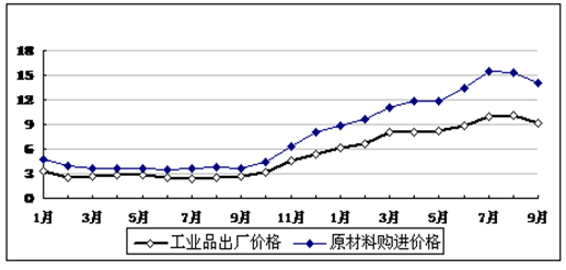 生产资料价格涨幅高位回落。9月份,流通环节生产资料价格比上月下降2.4%,已连续2个月环比下降;同比上涨17.5%,涨幅比上月回落5个百分点。工业品出厂价格同比上涨9.1%,比上月回落1个百分点;原材料、燃料、动力价格上涨14%。