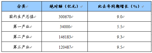 初步核算,全年国内生产总值300670亿元,比上年增长9.0%。分季度看,一季度增长10.6%,二季度增长10.1%,三季度增长9.0%,四季度增长6.8%。分产业看,第一产业增加值34000亿元,增长5.5%;第二产业增加值146183亿元,增长9.3%;第三产业增加值120487亿元,增长9.5%。