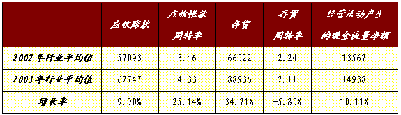 2003年我国通信设备制造业上市公司平均应收账款同比增长不到10%,低于主营业务收入增长幅度,同时,应收账款周转率同比增长25.14%,经营活动产生的现金流量净额同比增长10%。我们注意到,2003年通信设备制造业上市公司平均存货同比增长34.71%,而存货周转率却同比下降5.8%;存货大幅度增长主要由于分期收款发出商品存货同比增长59%和原材料存货同比增长26%,分期收款发出商品存货和原材料存货合计占存货总额的60%。