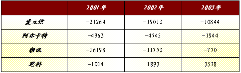 与中国通信设备制造业上市公司相比,2003年世界通讯设备制造业主要公司的业绩依然不尽人意。除了数据通信设备制造商美国思科公司2003年盈利35.78亿美元(约合296.14亿元人民币)以外,移动通信设备制造商瑞典的爱立信公司2003年亏损121.03亿瑞典克朗(约合138.36亿元人民币),光通信设备制造商美国朗讯公司2003年亏损7.7亿美元(约合63.73亿元人民币),数据通信设备制造商法国阿尔卡特公司2003年亏损5.24亿欧元(约合54.17亿元人民币)。