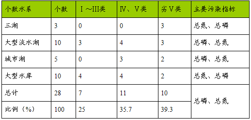 2003年度监测的28个重点湖库中,满足二类水质的湖库有1个,占3.6%;三类水质湖库有6个,占21.4%;四类水质湖库有7个,占25.0%;五类水质湖库有4个,占14.3%;劣五类水质湖库有10个,占35.7%。