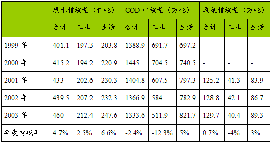 2003年,全国工业和城镇生活废水排放总量为460.0亿吨,比上年增加4.7%。其中工业废水排放量212.4亿吨,比上年增加2.5%;城镇生活污水排放量247.6亿吨,比上年增加6.6%。废水中化学需氧量(COD)排放总量1333.6万吨,比上年减少2.4%。其中工业废水中COD排放量511.9万吨,比上年减少12.3%;城镇生活污水中COD排放量821.7万吨,比上年增加5.0%。废水中氨氮排放总量129.7万吨,比上年增加0.7%。其中工业废水中氨氮排放量40.4万吨,比上年减少4.0%;城镇生活污水中氨氮排放量89.3万吨,比上年增加3.0%。