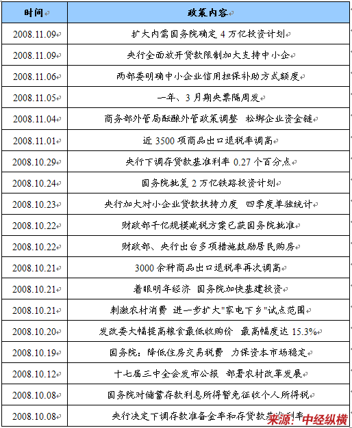 11月9日,国务院常务会议宣布对宏观经济政策进行重大调整,财政政策从“稳健”转为“积极”,货币政策从“从紧”转为“适度宽松”,同时公布了今后两年总额达4万亿元的庞大投资计划,明确要求“出手要快、出拳要重、措施要准、工作要实”。