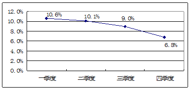08半年中国经济增长开始放缓,GDP同比增长10.4%,比去年同期回落1.8个百分点;居民消费价格水平上涨7.9%。这表明“防过热”已见效,但物价涨幅较高仍未得到有效控制。