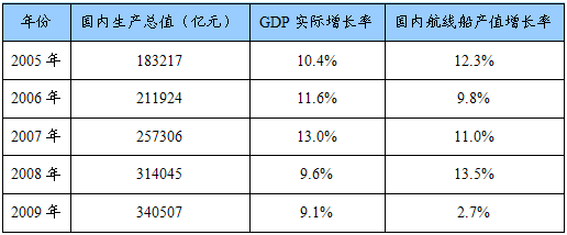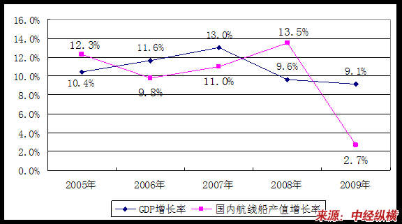 2005-2009年GDP及国内航线船增长率对比