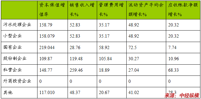 评价:从企业运营能力数据来看,我国目前污水处理企业中,销售收入增长最快的是私营企业,股份制企业次之,国有企业又次之。资本保值增值率为国有企业最好,私营企业次之,股份制企业又次之。管理费用方面私营企业增长最小,国营企业次之,股份制企业管理费用增长最大,控制成本方面最差。