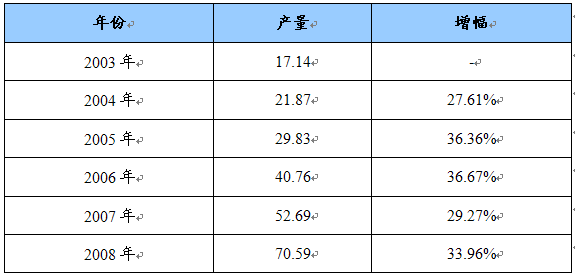 2003-2008年我国生物蛋白胶市场生产规模调查 单位:万套