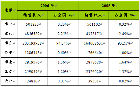 2006年涤纶纤维制造业产品销售份额集中度按地区